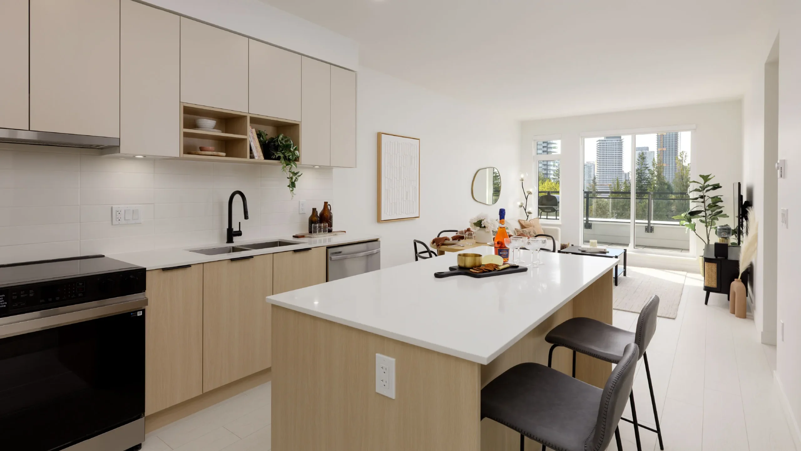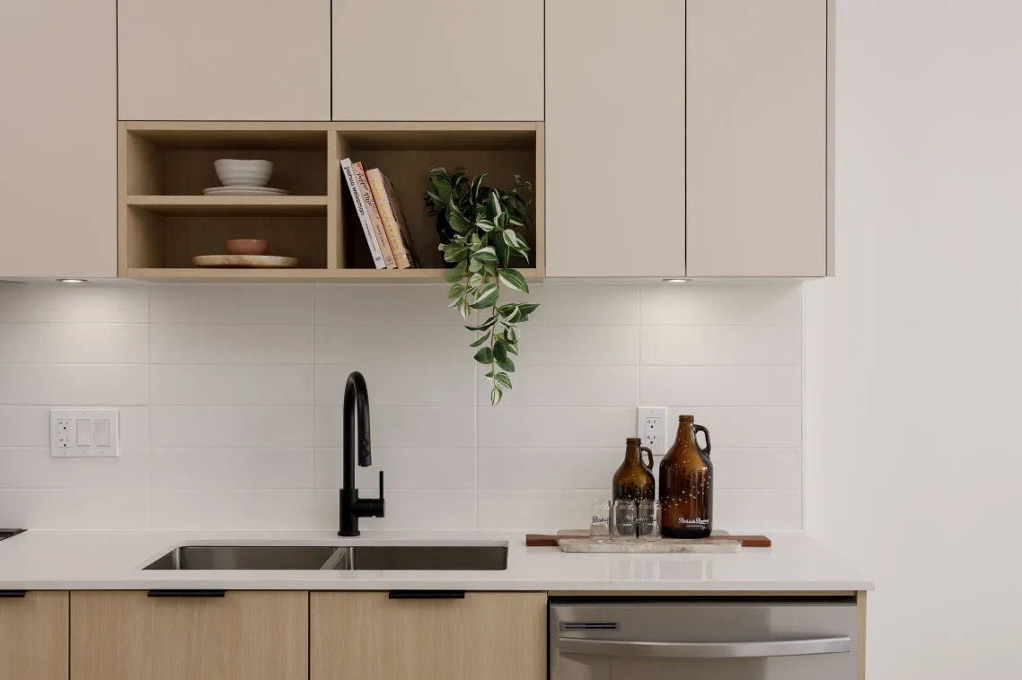 Matte black faucets anchor the space in modernity while sleek open shelving invites you to display curated cookbooks, tools, and greenery.